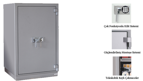 Kapının toplam kalınlığı 173 mm’dir. VdS-class 1 anahtar kilit ile kapanmaktador (satandardı 2 anahtarlıdır). RAL7035 gri rengine sahiptir.